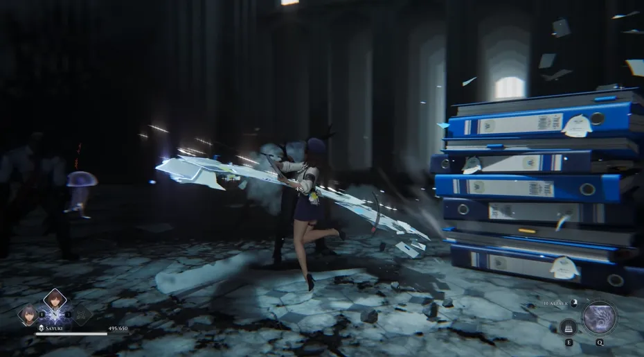 I suoi attacchi normali implicano l’uso dei documenti della polizia che ha in mano per infliggere danni fisici. Quando i nemici vengono attirati e raggruppati insieme, i giocatori non solo possono usare la sua abilitĂ elementale per evocare una pila piĂ¹ grande di documenti da abbattere sui nemici, ma anche attivare la sua esplosione elementale per richiamare un’enorme quantitĂ di documenti, scatenando un’esplosione aerea su un’ampia area.