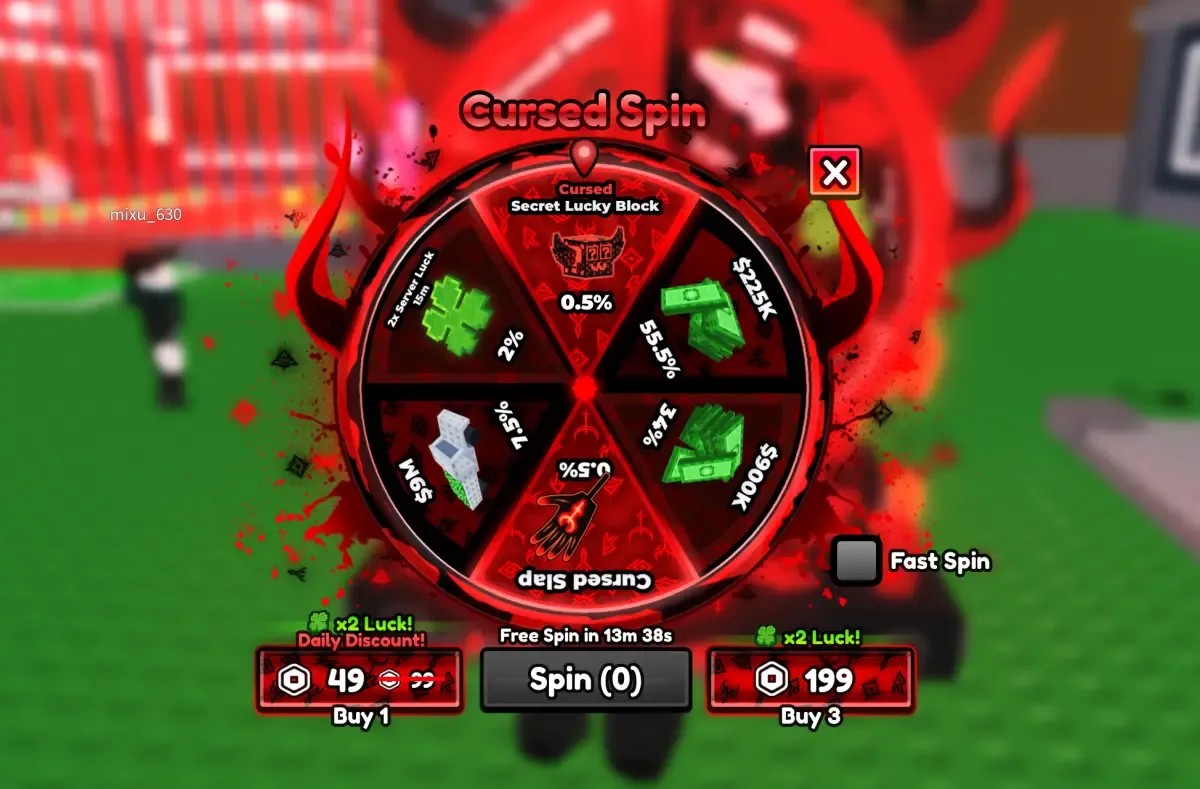 Riceverai un giro gratuito ogni ora. Giri aggiuntivi richiedono acquisti Robux, anche se l’acquisto di giri garantisce un moltiplicatore di fortuna 2x per probabilità migliorate. Il blocco fortunato segreto maledetto contiene Brainrots rari garantiti con mutazione maledetta applicata, rendendolo la ricompensa per giro singolo più efficiente possibile.
