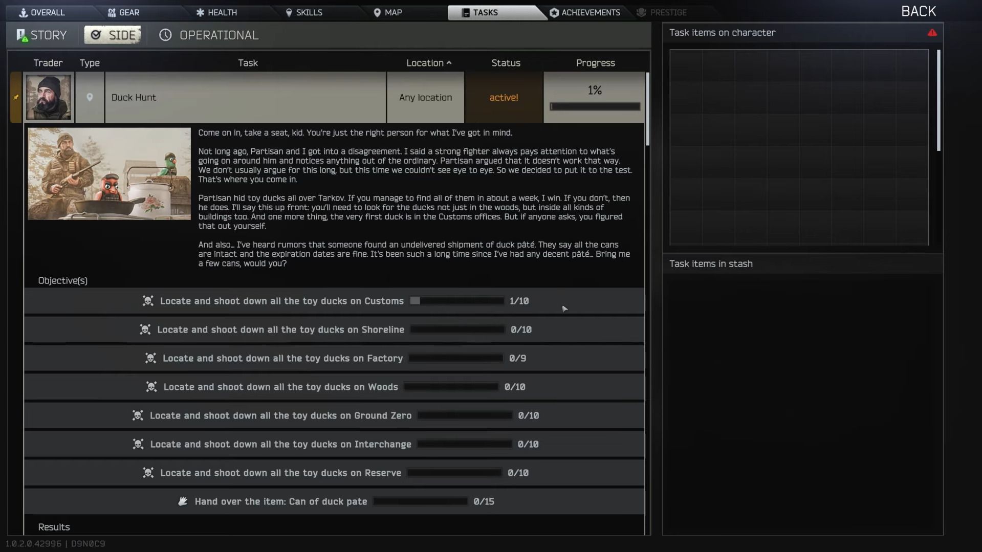 Il compito in sé è semplice sulla carta. I giocatori devono individuare e sparare a 69 anatre giocattolo nascoste nelle mappe di Tarkov. Ogni mappa contiene fino a dieci anatre, tranne la Fabbrica che ne ha nove. Oltre alle anatre, i giocatori devono trovare e consegnare anche 15 lattine di paté d’anatra.