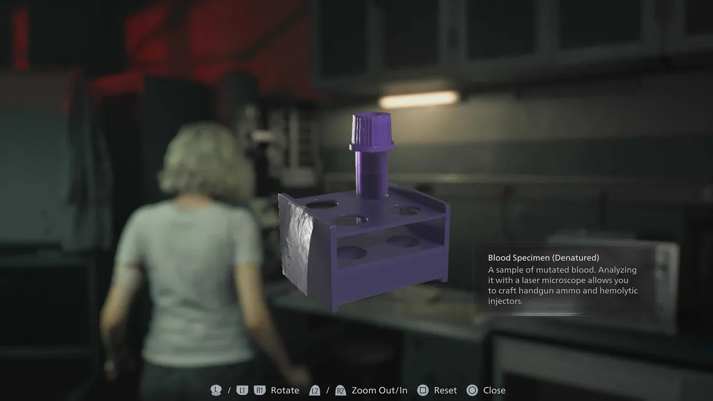 Tre campioni di sangue sono nascosti nel centro di cura. Analizzali ciascuno al microscopio laser (ce n’è uno nel laboratorio del sangue e un altro nell’ufficio al secondo piano) per sbloccare le ricette associate.