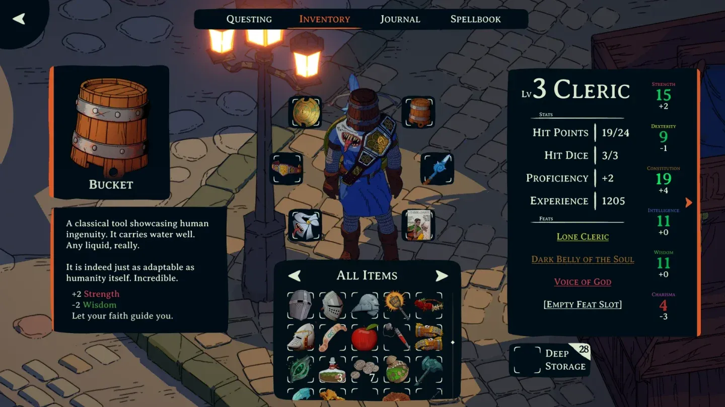 Questa statistica aumenta gli slot per incantesimi e la conoscenza magica, il che la rende essenziale per le build ricche di incantesimi. Un Chierico dotato di elevata Intelligenza risolve rapidamente i misteri e comprende i sistemi arcani. Un chierico con scarsa intelligenza può avere difficoltà con situazioni complesse o conoscenze magiche.