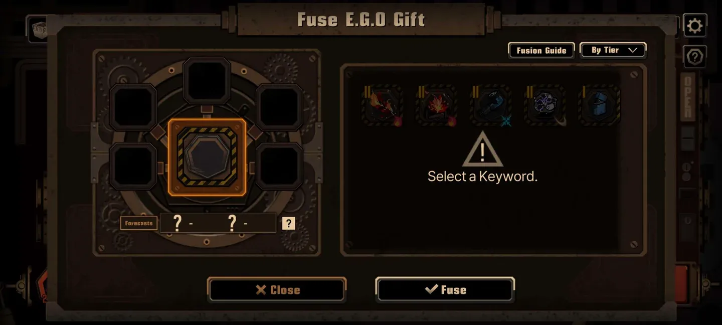 Quando esegui una fusione casuale (tutto ciò che non è una ricetta), seleziona prima una categoria di parole chiave come Brucia, Sanguinamento, Tremore, Rottura, Affondamento, Equilibrio, Carica, Taglio, Perforazione o Contundente. Il numero di regali che fondi influisce direttamente sulla probabilità di ricevere un regalo corrispondente a quella parola chiave.