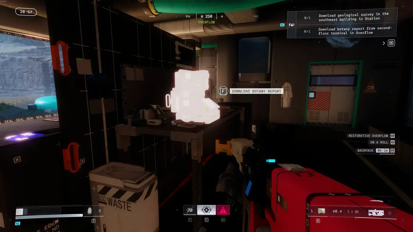 Un utile segnale ambientale: quando ti avvicini alla stanza giusta, l’illuminazione diventa blu, il che conferma che stai andando nella giusta direzione. Interagisci con il terminale per scaricare la relazione botanica e completare il contratto.