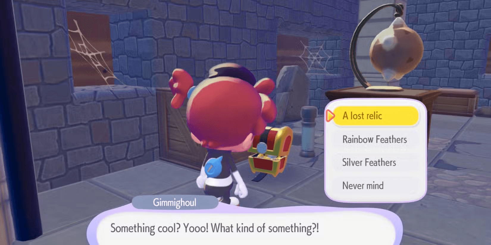 Parla con Gimmighoul e scegli “Ti ho portato qualcosa di bello!” opzione per attivare la sua specialità Raccolta. Puoi consegnare una reliquia perduta stimata (piccola o grande), una piuma arcobaleno o una piuma d’argento e lui restituirà un mobile raro casuale. Nessuna anteprima, basta premere conferma e lanciare i dadi.
