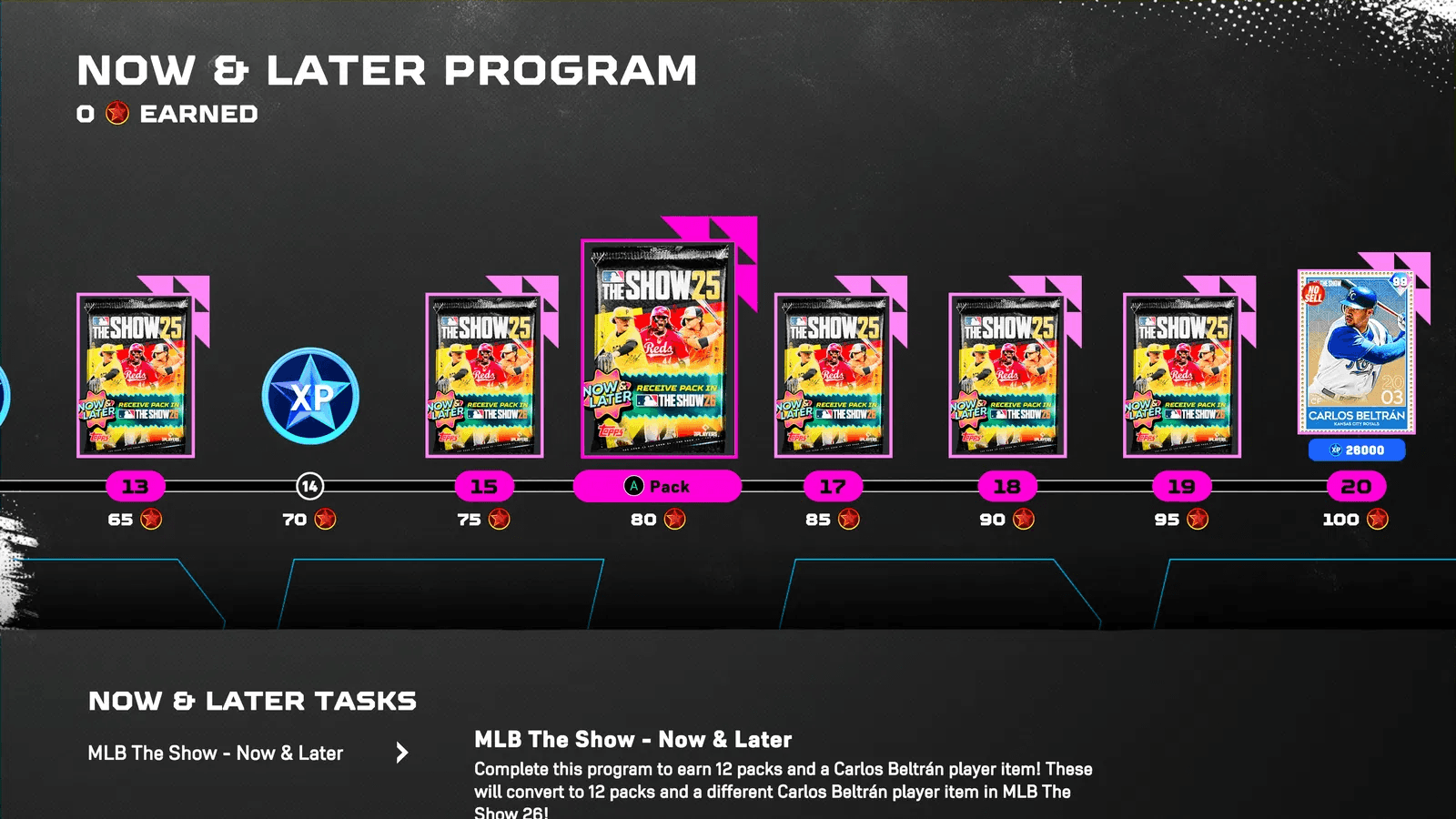I pacchetti Now and Later non venivano guadagnati direttamente in MLB The Show 26. Invece, i giocatori dovevano sbloccarli prima giocando a MLB The Show 25, principalmente attraverso attività Diamond Dynasty e programmi promozionali.