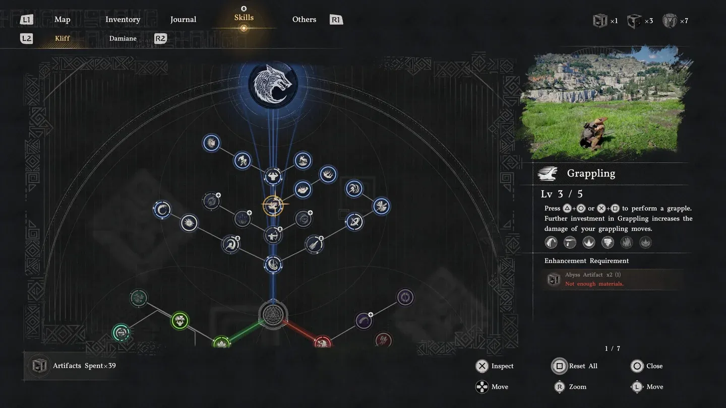 L’albero delle abilità è diviso in tre rami codificati a colori. Secondo fonti che coprono le meccaniche del gioco, l’albero rosso governa la resistenza e le abilità legate al volo, l’albero blu gestisce la salute e il combattimento senza armi e l’albero verde copre le abilità basate sullo spirito. Ogni personaggio, inclusi gli altri due personaggi giocabili Damiane e Oongka, ha la propria progressione di abilità separata, quindi i potenziamenti per Kliff non vengono trasferiti agli altri.