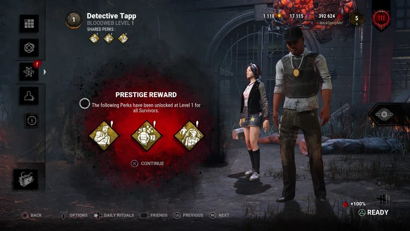 - Porta il prestigio del personaggio originale al Prestigio 1, 2 o 3. Ogni livello di prestigio aggiunge automaticamente il vantaggio unico di livello I, II e III di quel personaggio alle Tele Sanguinarie di tutti gli altri personaggi.