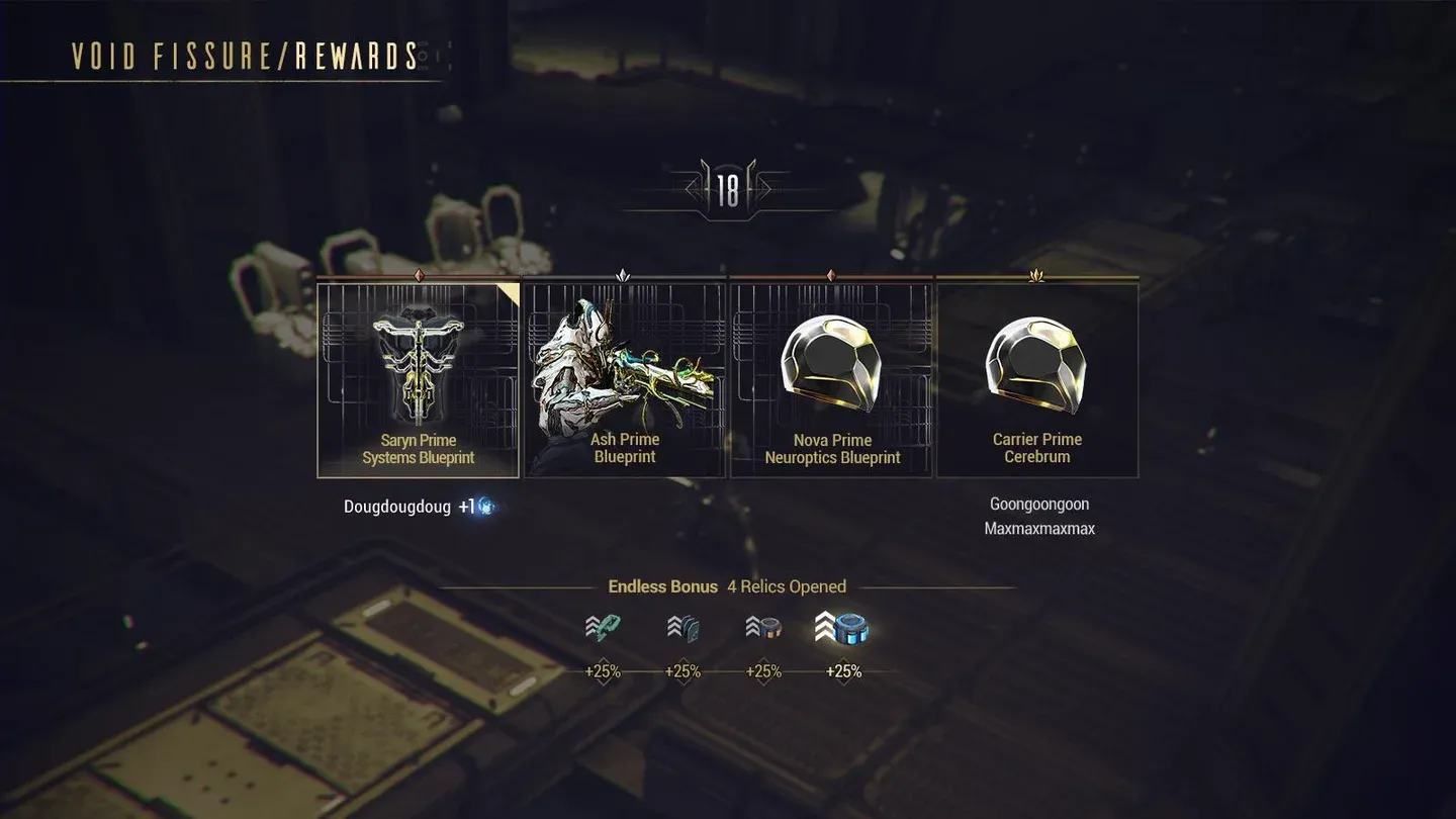 Un giocatore sul subreddit di Warframe ha condiviso la sua esperienza nel fare il suo primo Prime Resurgence con un pool di reliquie molto limitato. Hanno estratto 10 Aya dal surplus, hanno acquistato pacchetti di reliquie per Aya aggiuntiva, ne hanno coltivati altri due dai doni di Deimos e si sono ritrovati con 15 Aya in totale. Ciò è stato sufficiente per eseguire cinque reliquie Lith e Axi, tre reliquie Meso e due reliquie Neo prima di completare il set con una squadra di condivisione Rad.