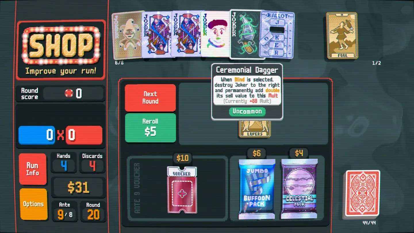 - Vendi quelli con performance inferiori. Un Joker da $ 4 che non si adatta più alla tua build vale di più come valuta del negozio che come slot morto. La vendita alimenta anche Swashbuckler, che aggiunge il valore di vendita combinato di tutti gli altri Joker al suo Mult.