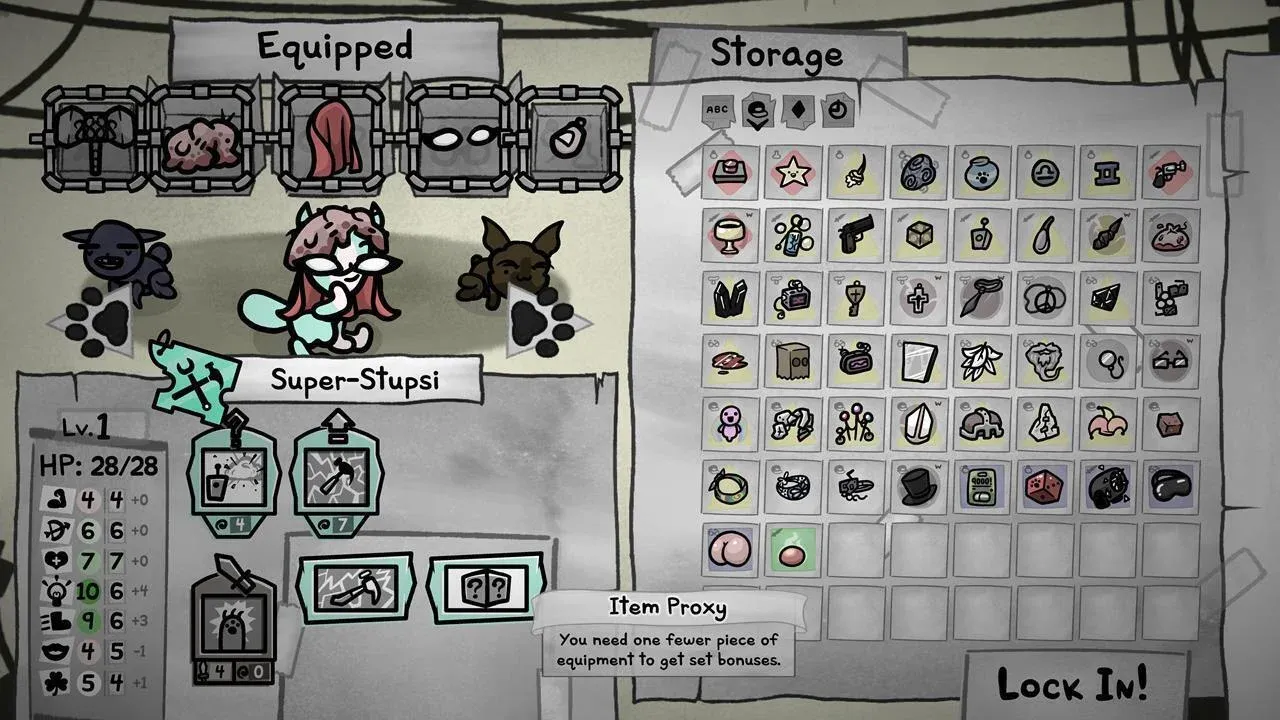 Mewgenics include bonus confermati per i set di oggetti. Alcuni pezzi di equipaggiamento a tema possono innescare effetti speciali o addirittura trasformazioni se indossati insieme. Il problema è che questi elementi non sempre condividono nomi ovvi.
