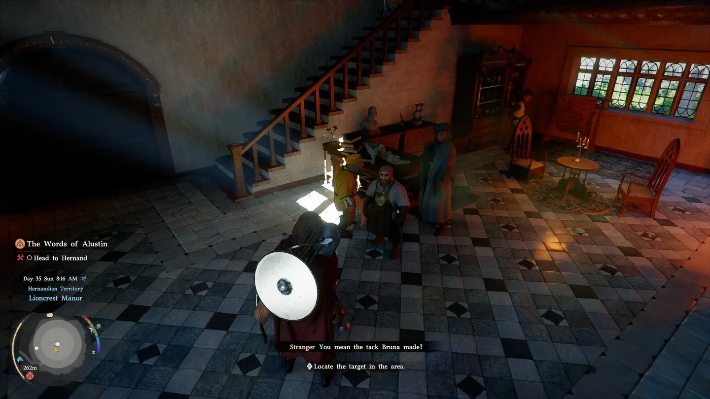 Una volta dentro, dirigiti verso la sala principale e scendi al primo piano. Un NPC nano indicato semplicemente come “straniero” attende al piano di sotto. Questo è il contatto per la richiesta di Bruna. Parla con loro per ricevere il feedback richiesto sulle virate, quindi segui l’indicatore di missione fino all’Assistente di Bruna per chiudere la missione.