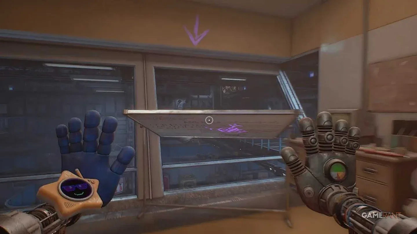 Trascina quella piattaforma completamente a sinistra. Diventa un ponte improvvisato che attraversa un divario che altrimenti non potresti attraversare. Attraversalo e ti ritroverai all’ingresso dell’ufficio principale, dove ti aspetta l’armadietto della mano a pressione.