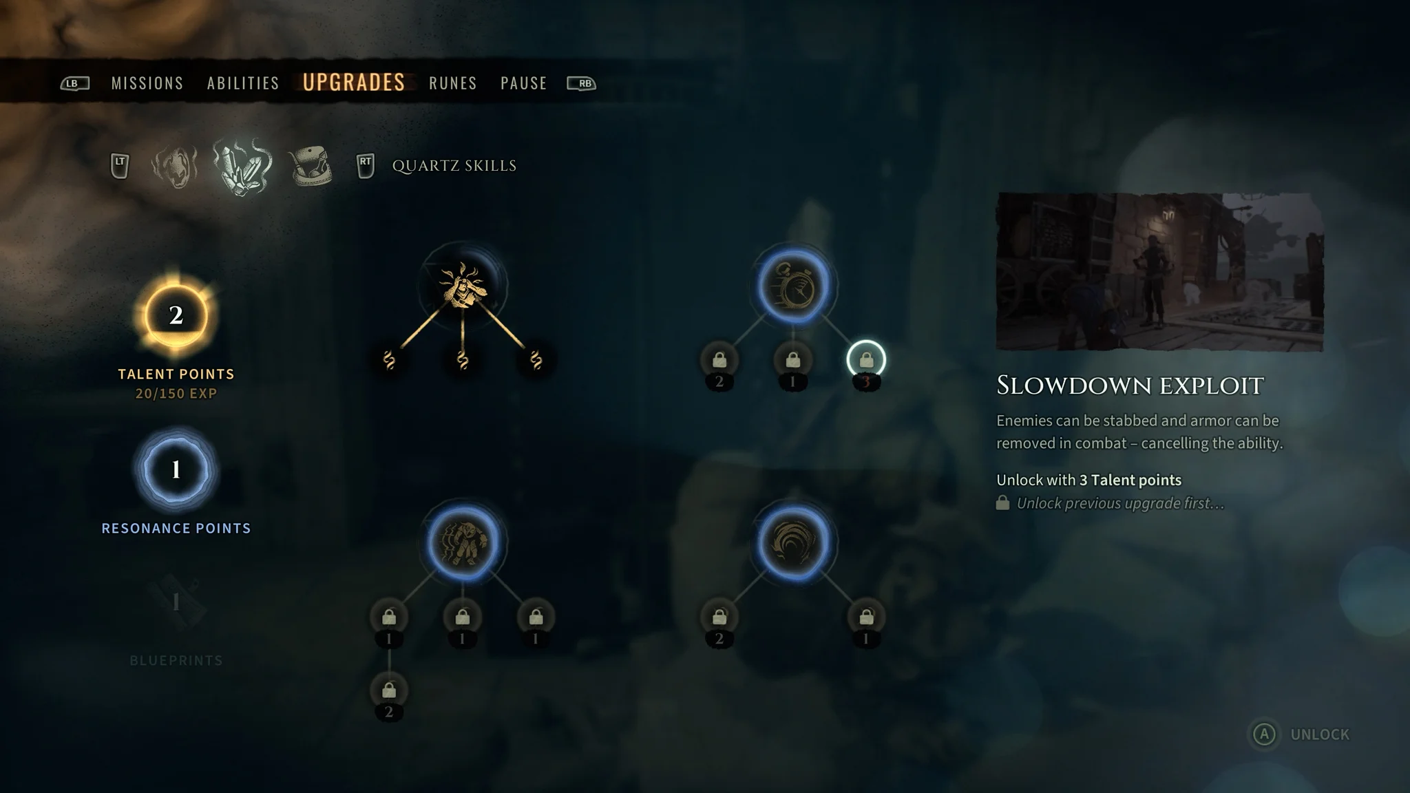 Continua ad assorbire abbastanza quarzo totale e guadagnerai punti Risonanza raggiungendo i traguardi. Il primo arriva alla fine dell’Atto 1. Questi ragazzacci sono più rari e sbloccano solo i quattro grandi poteri del quarzo. Non li spendi come punti talento. Li usi per aprire l’intera nuova categoria di abilità.