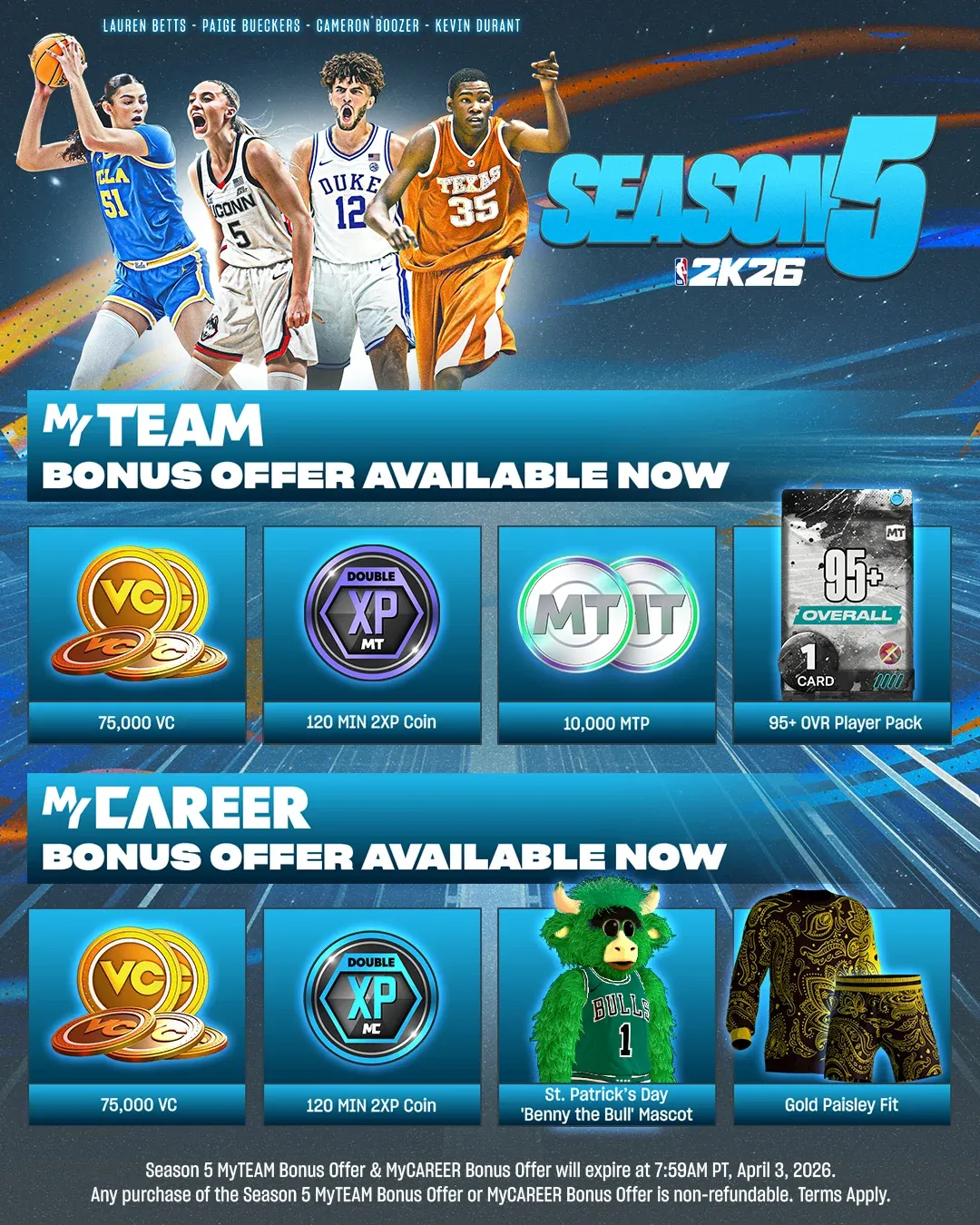 NBA 2K26 Stagione 5 porta l’emozione del basket universitario direttamente sulla tua console con nuovi contenuti a tema che includono 16 potenti programmi NCAA. Che tu scelga il blu Duke o scelga l’equipaggiamento dei Wildcats, questa stagione offre un’autentica rappresentanza universitaria nelle modalità La mia SQUADRA e La mia CARRIERA. Il pezzo forte sia per i collezionisti che per i giocatori competitivi è il College Celebration Box, una ricompensa gratuita ricca di talenti universitari attuali pronti a mettersi in gioco.