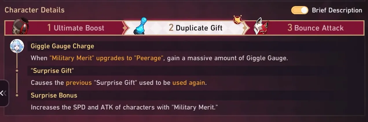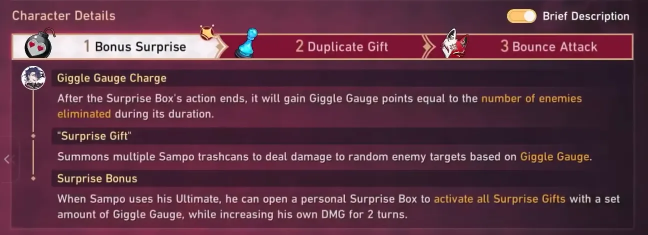 Quando la casella della sorpresa sulla barra delle azioni entra in azione, il comico attiverà il regalo a sorpresa. Il Comico può caricare la Scatola delle Sorprese per potenziare l’effetto del Regalo a Sorpresa.