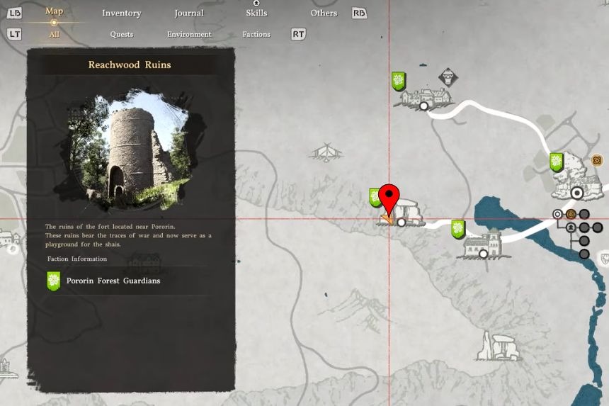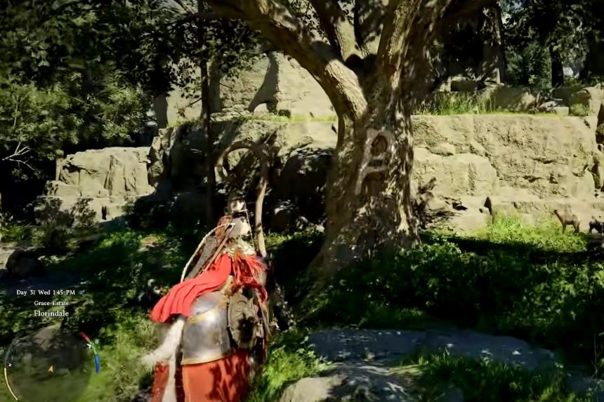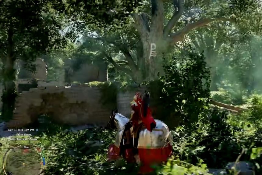 Albero 5: Trova un albero con un segno bianco simile a una “P” con tre linee orizzontali. L’albero si trova alle Rovine di Reachwood.