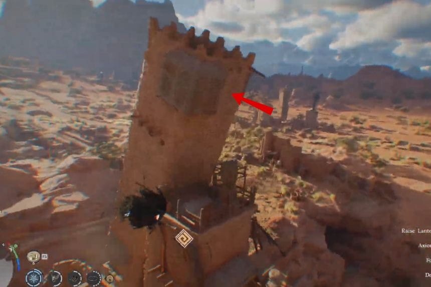 Subito dopo aver iniziato, noterai che c’è un edificio inclinato proprio di fronte a te. Gira attorno ad esso sul retro e colpiscilo tre volte usando Force Palm livello 3. Questo è l’unico modo attraverso il quale puoi spostare questa struttura e rivelare l’apertura segreta. Entra nell’edificio e colpisci il gadget usando Force Palm per sbloccarlo e raccogliere la tua pietra.