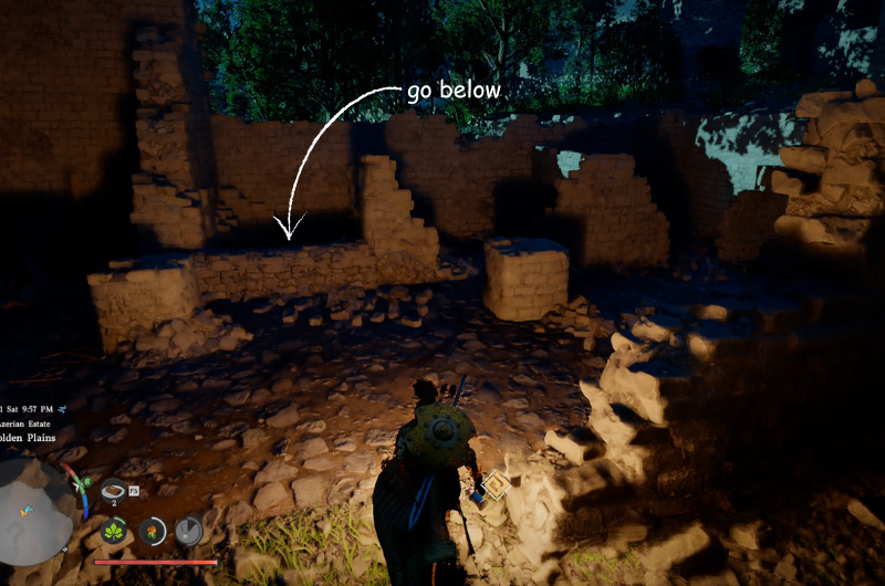 Presso le rovine dovresti essere in grado di vedere un sentiero che conduce verso il basso seminterrato come mostrato nell’immagine sopra. Scendi di sotto e fatti strada all’interno e segui il percorso, alla fine raggiungerai una stanza con trappoledevi raggiungere rapidamente l’altro lato prima che le trappole inizino a sparare, quindi fai a correre all’altro lato.