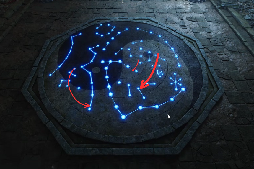 Per questo esagramma, la soluzione è piuttosto semplice. Ruota i pannelli del soffitto finché la Tigre Bianca non si allinea con le porte del recinto. Quando è impostato correttamente, il simbolo nella parte superiore della porta inizierà a illuminarsi. Una volta che ciò accadrà, le porte si apriranno, quindi vai avanti ed entra. All’interno del recinto troverai un puzzle di costellazioni sul pavimento. Usa la piattaforma Bagua della stella polare per ruotare i tre anelli finché le costellazioni non si collegano tra loro.