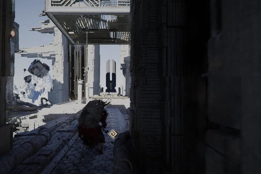 Dopo il combattimento con il boss Crowcaller, viaggia velocemente indietro al Nexus dell’Abisso del Nido del Corvo e vai verso la posizione del puzzle successivo nell’Anello del Triangolo, Corona del Monolito. Da lì, cammina verso la struttura fino a raggiungere la Porta dell’Abisso.