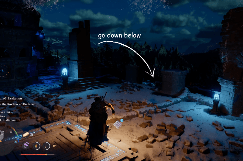 Salto giù oltre la sporgenza dal buco e noterai a spacco nel muro che è stato bloccato ghiacciorompi il ghiaccio usando le tue abilità e l’acqua all’interno dovrebbe drenare.