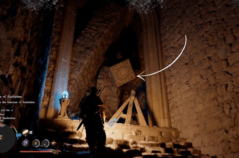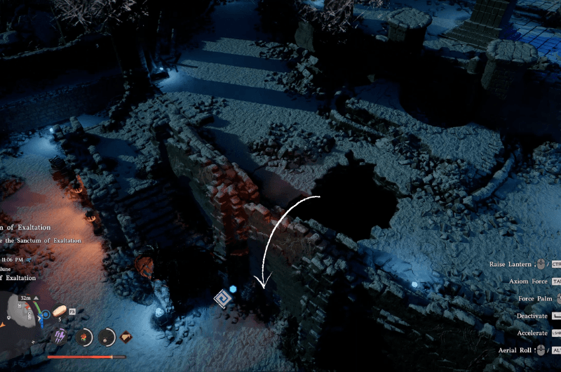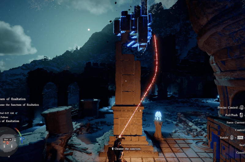 C’è un vuoto fessura a lato del Sanctum, posiziona il nucleo del reattore che assomiglia a a cubo vicino allo slot e dove il nucleo l’ambiente circostante inizia a mostrare foglie verdi galleggiantiutilizzare il Palmo della Forza abilità sul nucleo per spingerlo nella fessura.