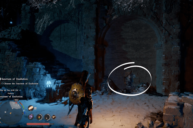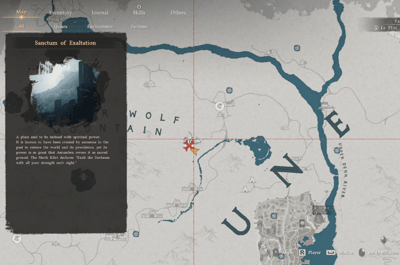 IL Santuario dell’Esaltazione si trova a est delle Montagne del Lupo d’Argento in Pailune come mostrato nell’immagine sopra. Il santuario, tuttavia, è sotto il controllo di una fazione nemica: Ordine di Antumbra. Devi liberare il santuario prima di procedere con il processo di pulizia.