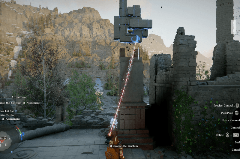 Fai lo stesso con il secondo nocciolo del reattoreutilizzo Forza assioma per posizionarlo sopra il pilastro rotto, quindi salire sul nucleo e utilizzare Palmo della Forza Aerea per spingere il nocciolo del reattore in posizione.