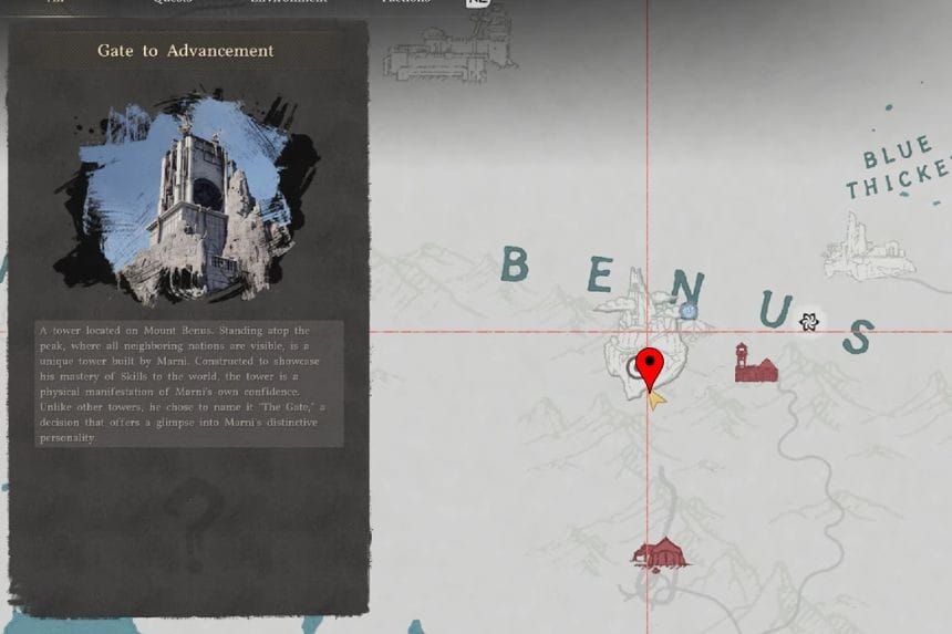Questo puzzle può essere trovato all’interno di una struttura situata vicino al Monte Benus a Delesyia, nella regione della Porta dell’Avanzamento. Fa parte del percorso da seguire, quindi dovrai risolverlo prima di poter continuare più in profondità. Per fare ciò, devi prima recarti nella regione della torre di guardia. Devi continuare a salire sulla montagna finché non raggiungi la vetta.