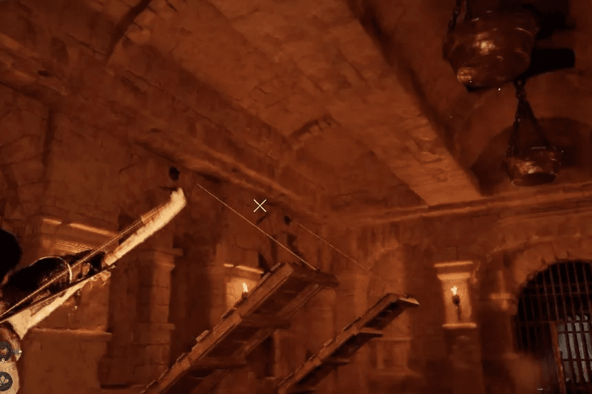 Una volta fatto ciò, tutto ciò che devi fare è bruciare le viti che bloccano la strada verso l’ingresso con l’uso dell’abilità Lampo accecante. Quindi, una volta dentro, procedi nella camera sottostante. Quando ti avvicini all’area chiodata, non dovresti avanzare subito, ma scoccare prima frecce contro le corde per distruggere le piattaforme sospese e attraversare in sicurezza, evitando le trappole oscillanti lungo il percorso.