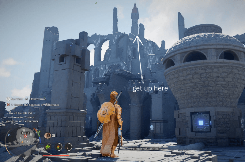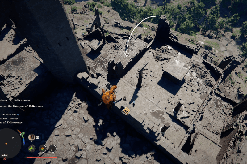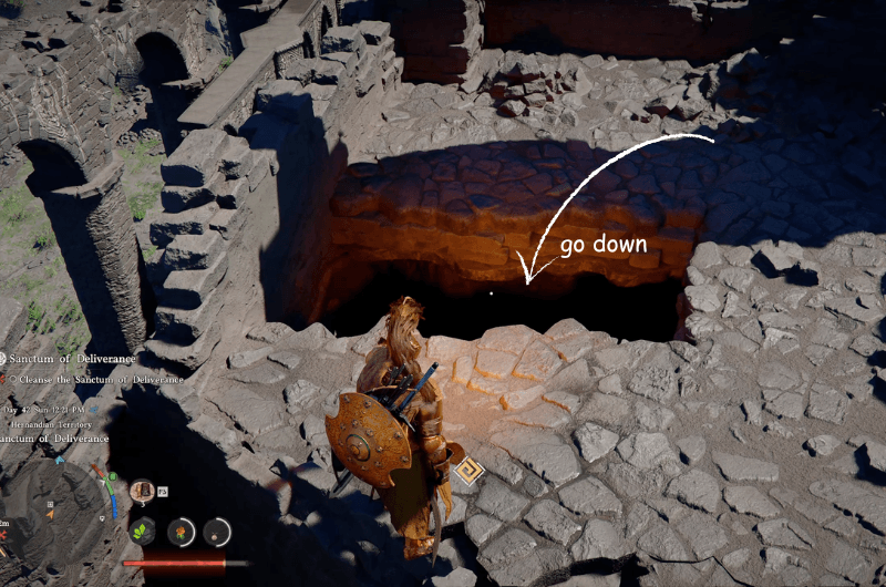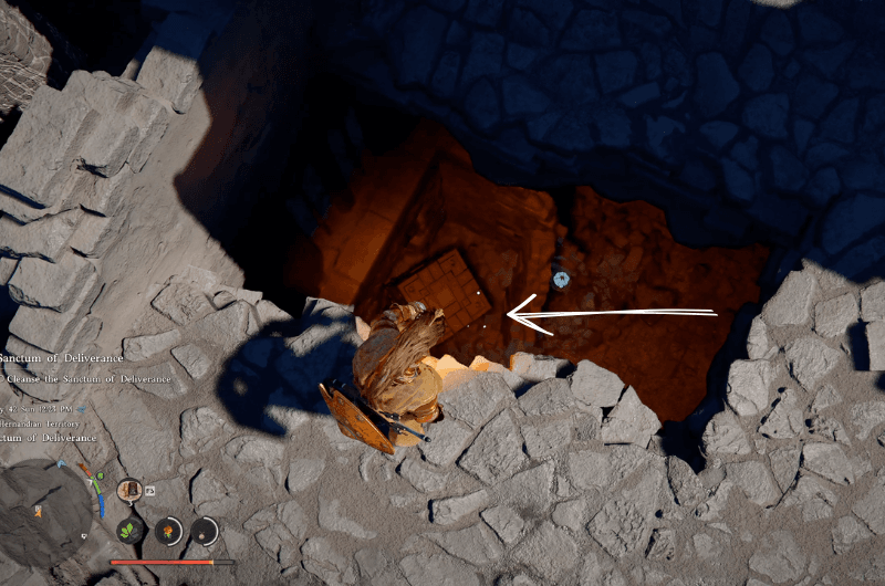 Dirigiti verso la posizione mostrata nell’immagine sopra, a tetto con il torre più alta delle rovine. Lì dovresti vedere a buco quello porta alla stanza sottostante, se non vedi il buco allora in piedi in quel luogo per pochi secondi e il terreno sottostante crollerà e rivelerà il sentiero.