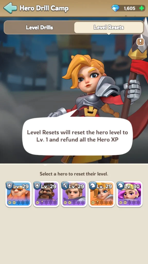 Nel Ripristino del livello scheda, puoi recuperare l’EXP eroe che hai speso per gli eroi che ora si trovano negli slot Drill. Se hai utilizzato molta EXP eroe su un eroe prima di sbloccare il campo di addestramento e quell’eroe si trova ora in uno slot di addestramento, puoi ripristinarli per recuperare l’EXP spesa.