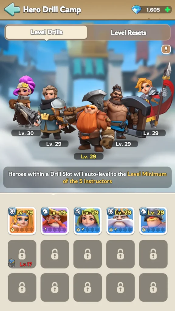 In questa scheda puoi sceglierne 5 Istruttori di perforazione. Sotto di loro, vedrai Scanalature per trapanodove puoi posizionare altri eroi. Man mano che aggiorni il tuo centro città, si sbloccheranno più slot per esercitazioni.