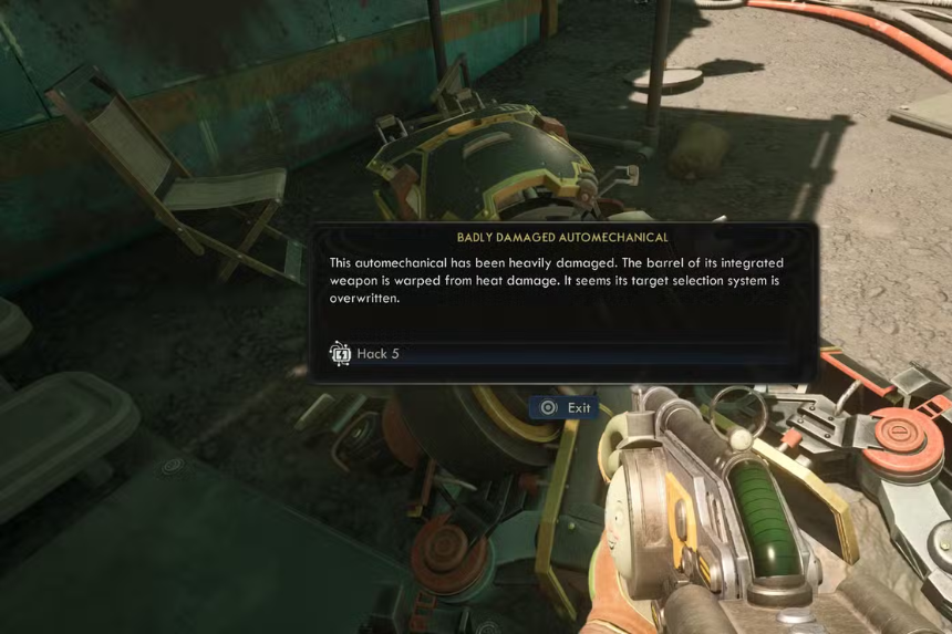 Vicino al centro del campo, vicino a un certo numero di container e sedie, c’è un automech distrutto. Esaminarlo richiede Hack Livello 5.