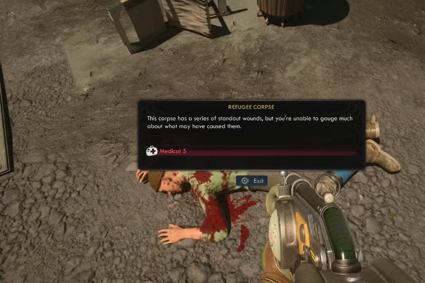 Al centro del campo giace il corpo di un rifugiato che sembra essere stato colpito da colpi di arma da fuoco mentre fuggiva. Usa il livello medico 5 sul corpo per ottenere maggiori informazioni.