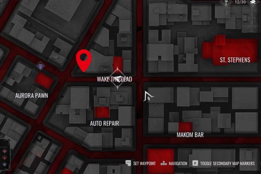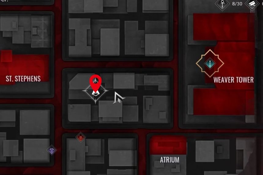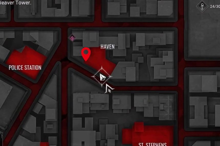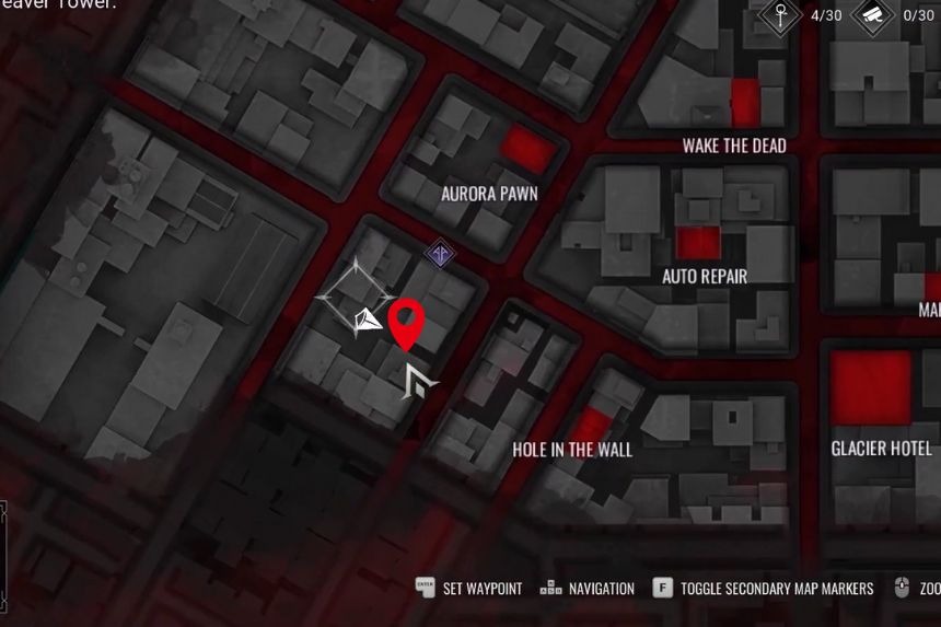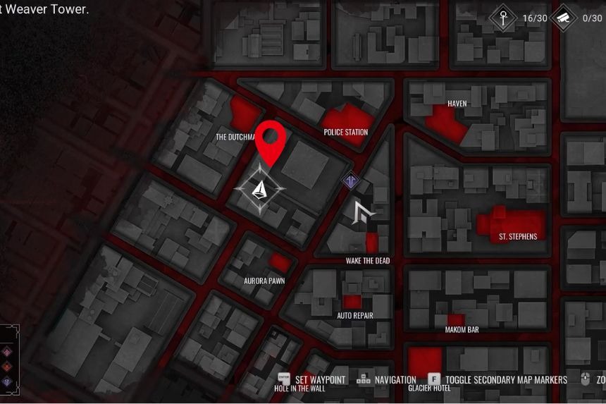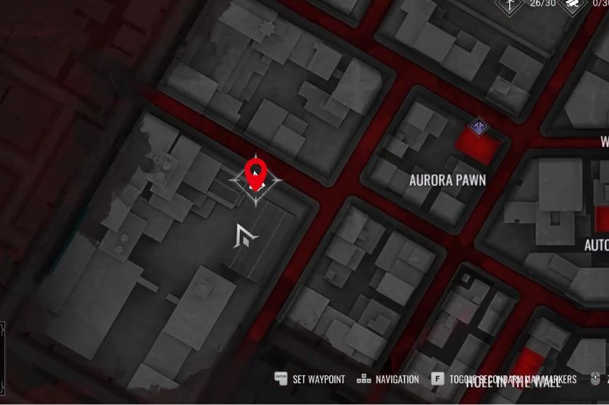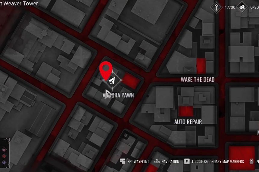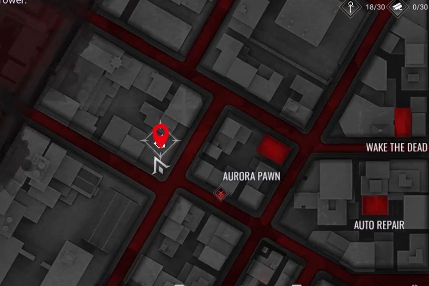 Controlla la guglia della torre nell’isolato a ovest di Aurora Pawn. Devi solo salire sull’edificio per individuare la torre di fronte a te.