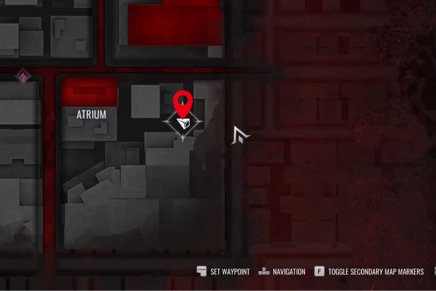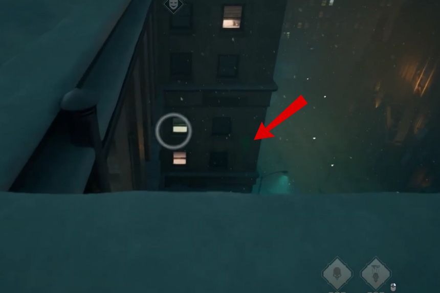 Dirigetevi verso il vicolo a est dell’Atrium. Di fronte al cantiere, vedrai un edificio con un’etichetta in cima. Sali per prenderlo.