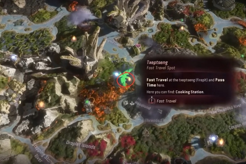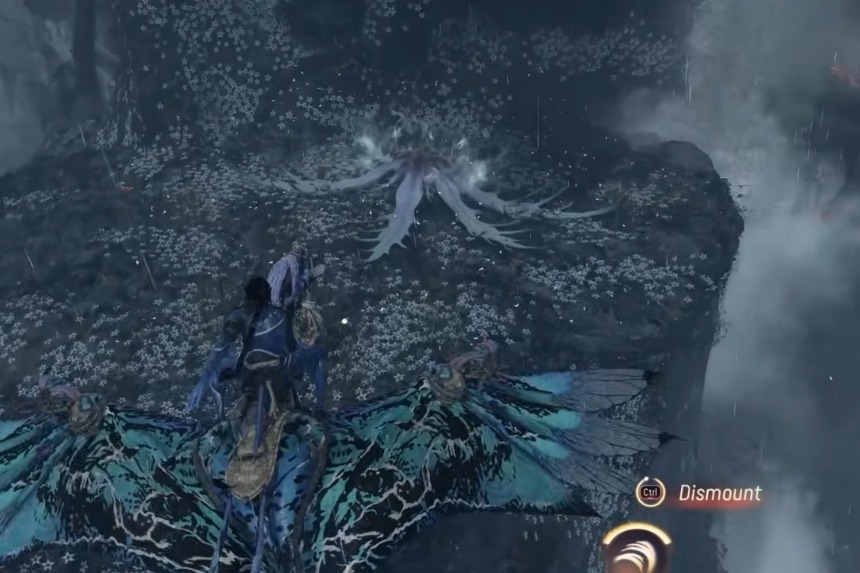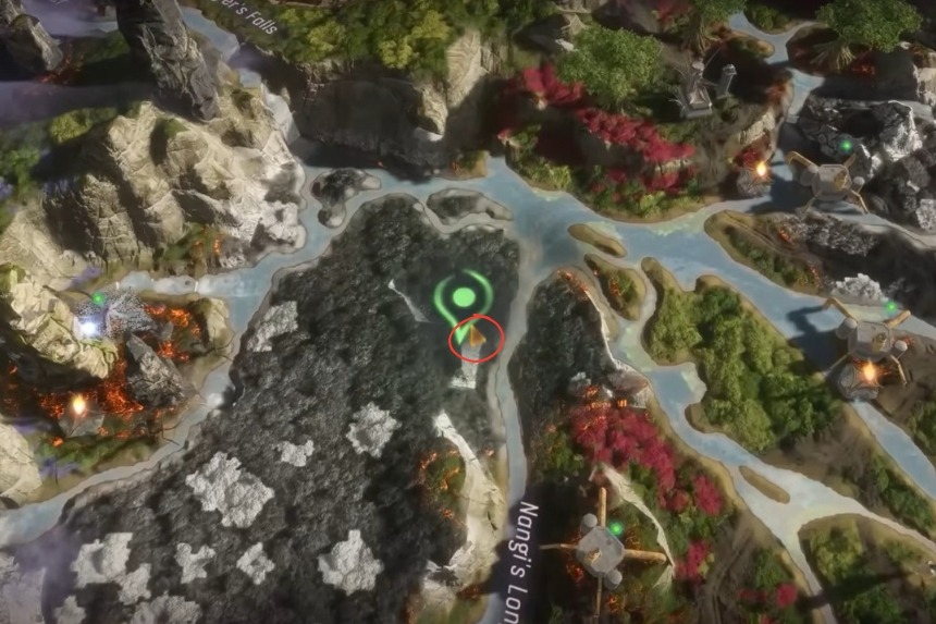 Per ottenere questo frutto Zeykoma, dovrai recarti nell’area vicino a Fort Prometheus. È un territorio montuoso, quindi vola con Ikran nella posizione mostrata nell’immagine della mappa sopra e troverai il frutto Zeykoma in cima a una scogliera, circondato da fiori tana’ring.