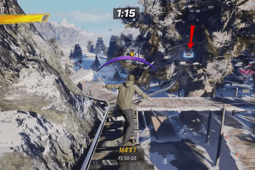 Inizia girandoti e girando per acquisire un po’ di slancio, quindi sali la rampa e atterra sulla piattaforma sopra. Continua a muoverti in quella direzione finché non raggiungi la passerella di legno vicino al quarter-pipe accanto all’Half-Pipe.