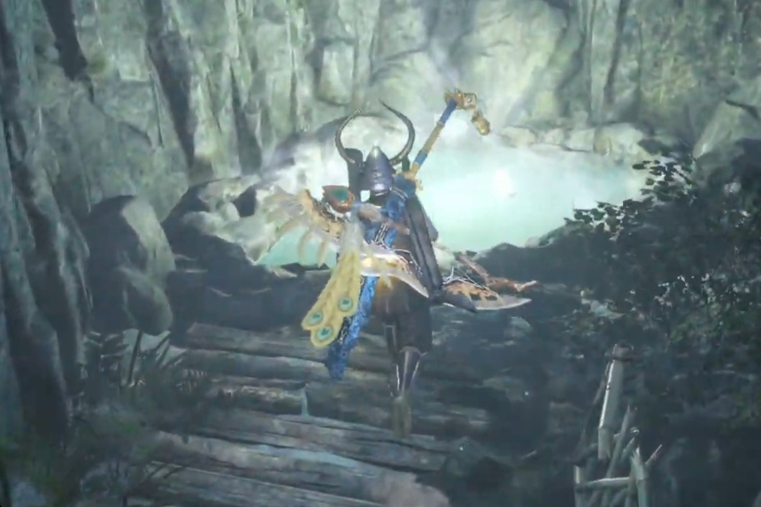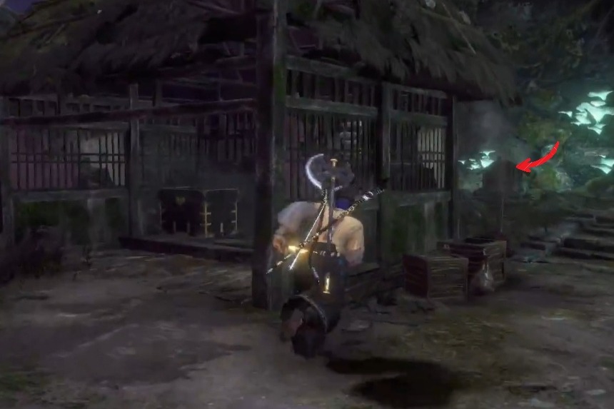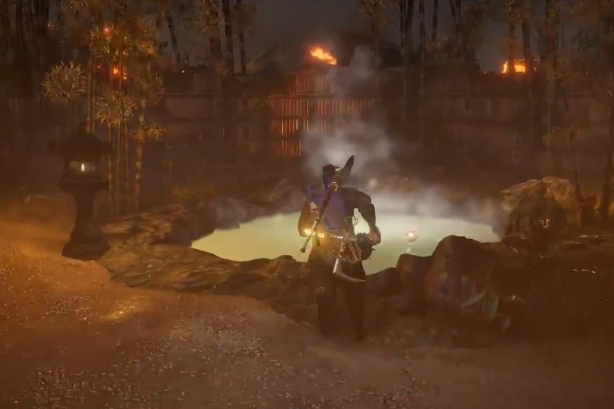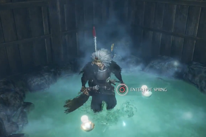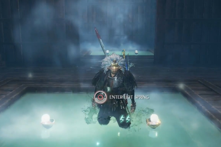 Procedi oltre il muro di Nurikabe all’interno della casa vicino all’NPC amichevole che si unisce a te. Dalla piccola casa dove è stato aperto un grande baule, prendi il sentiero a destra dove incontrerai un Rokurokubi e un soldato che brandisce un’ascia. La sorgente termale è proprio dietro l’angolo a destra dopo di loro.