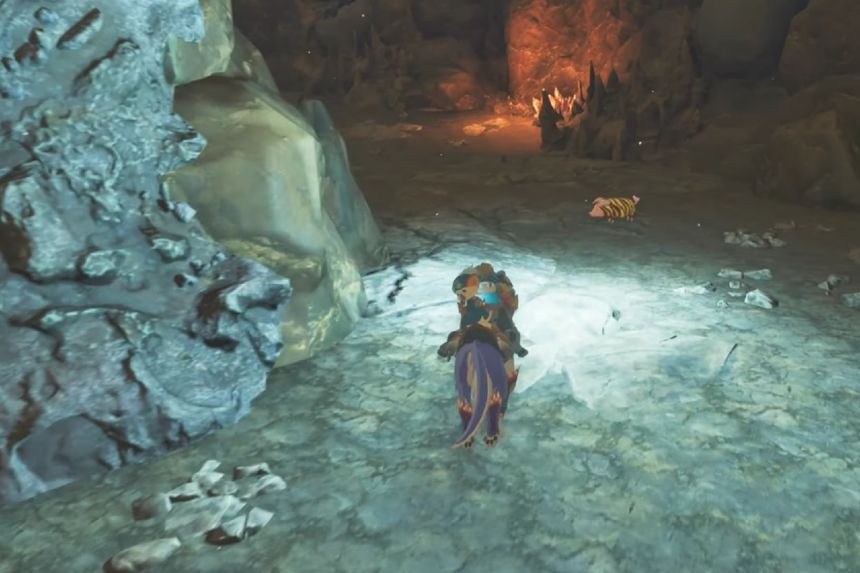 Vicino alla tana dei mostri troverai una struttura rocciosa al centro della mappa. Vai verso il lato della struttura rocciosa per trovare il Poogie vicino ai cristalli.