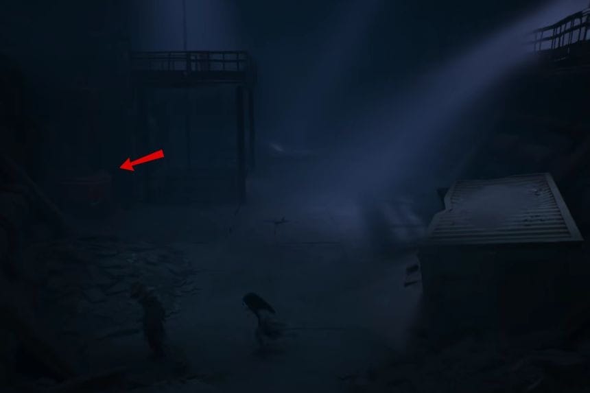 Una volta dentro la nave, salta giù dal contenitore di metallo e cammina verso l’ascensore. Vicino all’ascensore c’è una barca con un poster attaccato.
