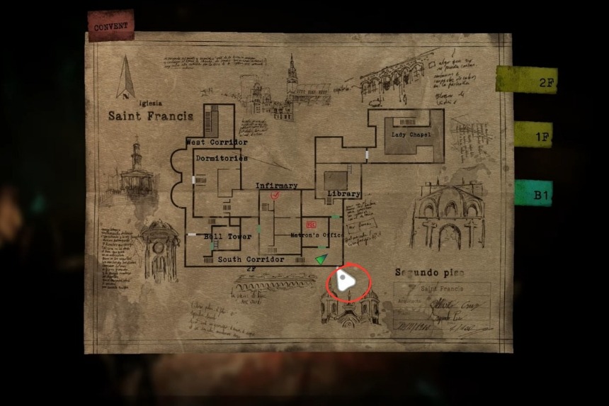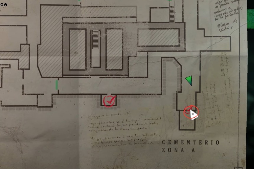 Per il Diario 6 di Madre Lucia, vai a destra dopo aver preso il Diario 1 di Miguel e ti imbatterai in una porta che ti condurrà alla Manutenzione delle fogne. Continua ad andare a destra e ti imbatterai in un cadavere con diversi aghi appuntati sopra; accanto ci sarà un tavolo con sopra il diario.
