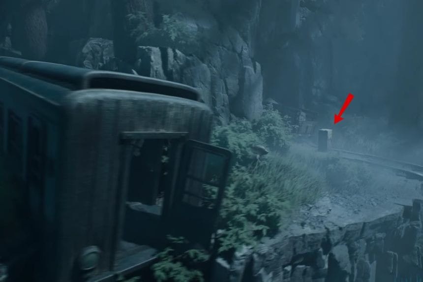 Dopo aver spinto il carrello lungo i binari del treno e aver raggiunto la fine per saltare giù, torna fuori dal tunnel e segui la seconda serie di binari in direzione sud-est. Vedrai un treno dettagliato e abbandonato. Entra nel treno ed esci dal lato destro alla fine. Di fronte a te, sui binari rotti, c’è la prima bara.
