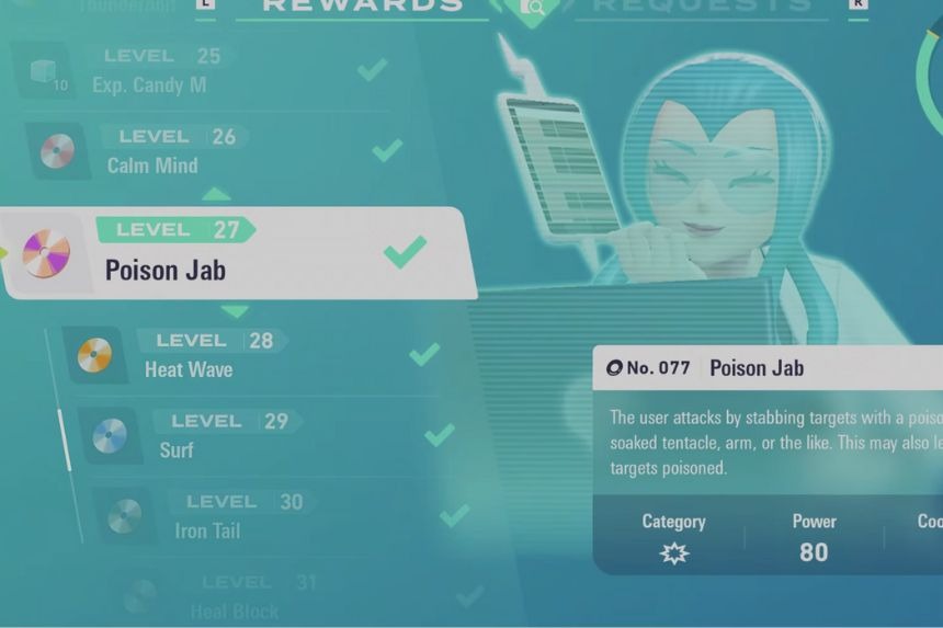 Poison Jab è una mossa di tipo Veleno in cui il tuo Pokémon colpisce il nemico con un colpo tossico, solitamente usando un braccio, un tentacolo o qualcosa di simile. Oltre al danno consistente, c’è anche una buona probabilità che lasci il bersaglio avvelenato. Puoi sbloccare questa TM dopo aver raggiunto il livello di ricerca 27 con Mable.