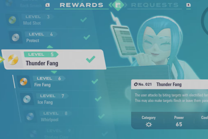 Tuonodenti è una mossa di tipo Elettro in cui il tuo Pokémon affonda le sue zanne cariche nel bersaglio. Ha anche un bel bonus: l’attacco a volte può far sussultare l’avversario o addirittura lasciarlo paralizzato. Puoi sbloccare questa TM una volta raggiunto il livello di ricerca 5 con Mable.