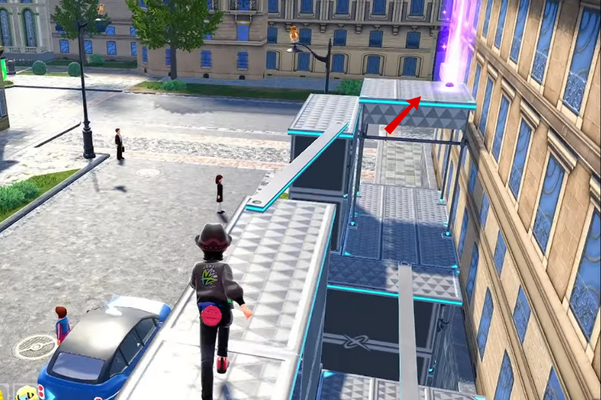 Dirigiti verso il Settore Bleu 7 e sali sull’impalcatura lì. Una volta che sei abbastanza in alto, usa il tuo Roto Glide per raggiungere il tetto vicino. Spostati a sud sui tetti e, dopo aver attraversato un ponte, vedrai la vite colorata.