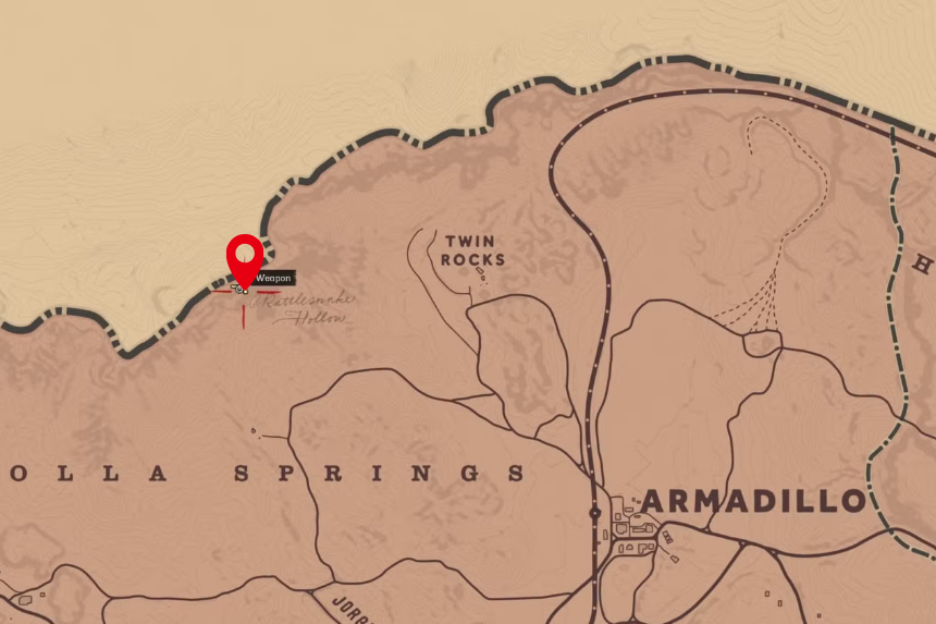 Questo tesoro si trova all’interno di Rattlesnake Hollow, a ovest di Twin Rocks a New Austin. Nota che quest’area è accessibile solo durante l’epilogo; andare presto ti farĂ immediatamente beccare. All’interno troverai le 5 fotografie erotiche, il Revolver di Ottis Miller.