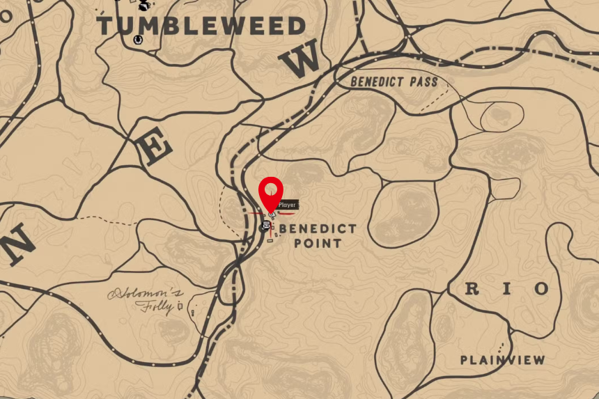 Dirigiti a Benedict Point (a sud di Tumbleweed). Sali sulla struttura di legno lungo i binari, attraversa il ponte traballante e guarda in un varco a metĂ strada. All’interno troverai Horse Reviver, The Elemental Trail Map 3.