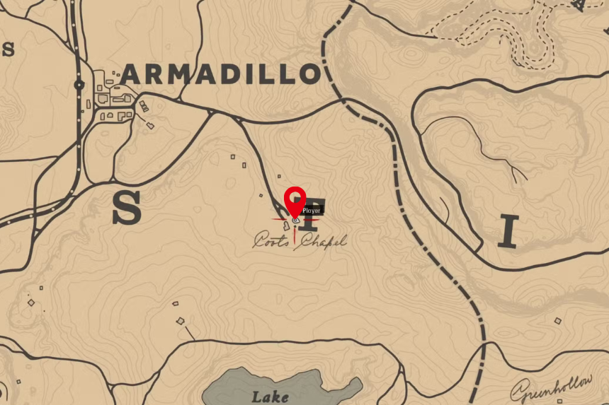 L’ultimo tesoro si trova nella Cappella di Coot, a sud di Armadillo. Guarda sotto la roccia seduta sopra una lapide di legno sotto un albero. All’interno troverai lo stimolante speciale per i cavalli, la medicina speciale per i cavalli, il lingotto d’oro e il gingillo a becco di corvo.